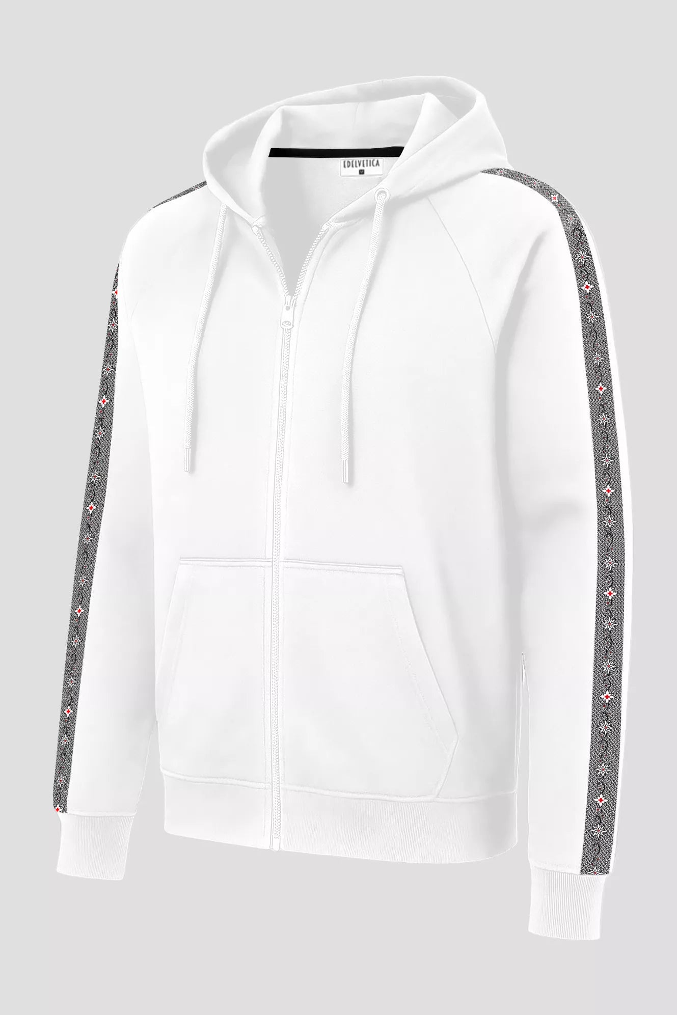 Die Sweatjacke präsentiert unser eigenes, liebevoll gezeichnetes Edelweiss-Design, das moderne Handwerkskunst mit einem Hauch von lokaler Tradition verbindet.