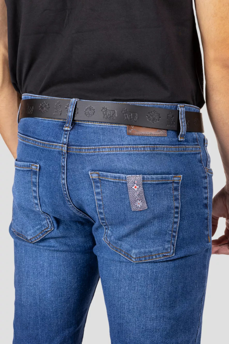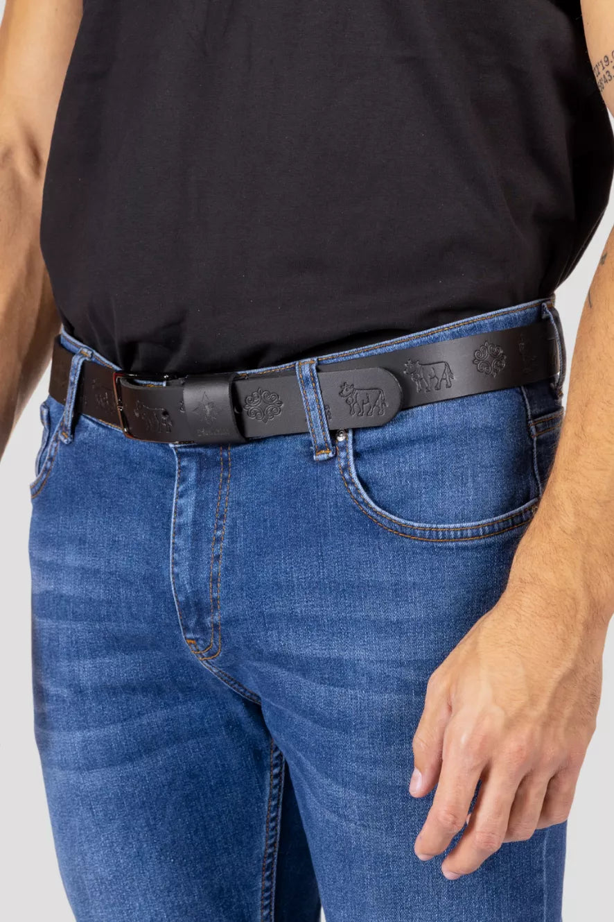 Der Appenzeller Gürtel aus schwarzem Leder verbindet traditionelle Schweizer Trachtenmotive mit moderner Eleganz. Die feinen Gravuren von Kühen und Blumen machen ihn zu einem stilvollen Accessoire, das Qualität, Tradition und Handarbeit aus der Schweiz vereint.
