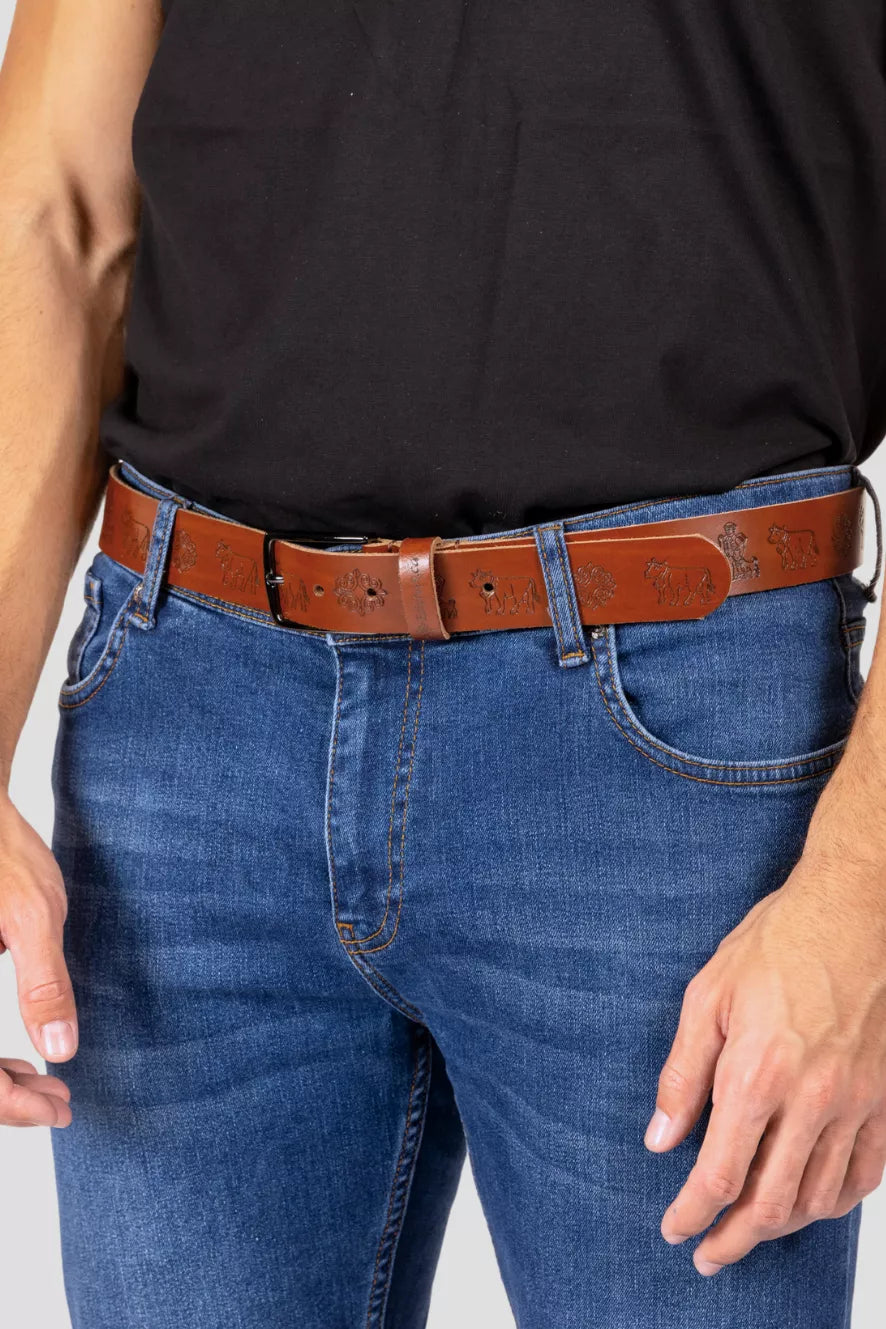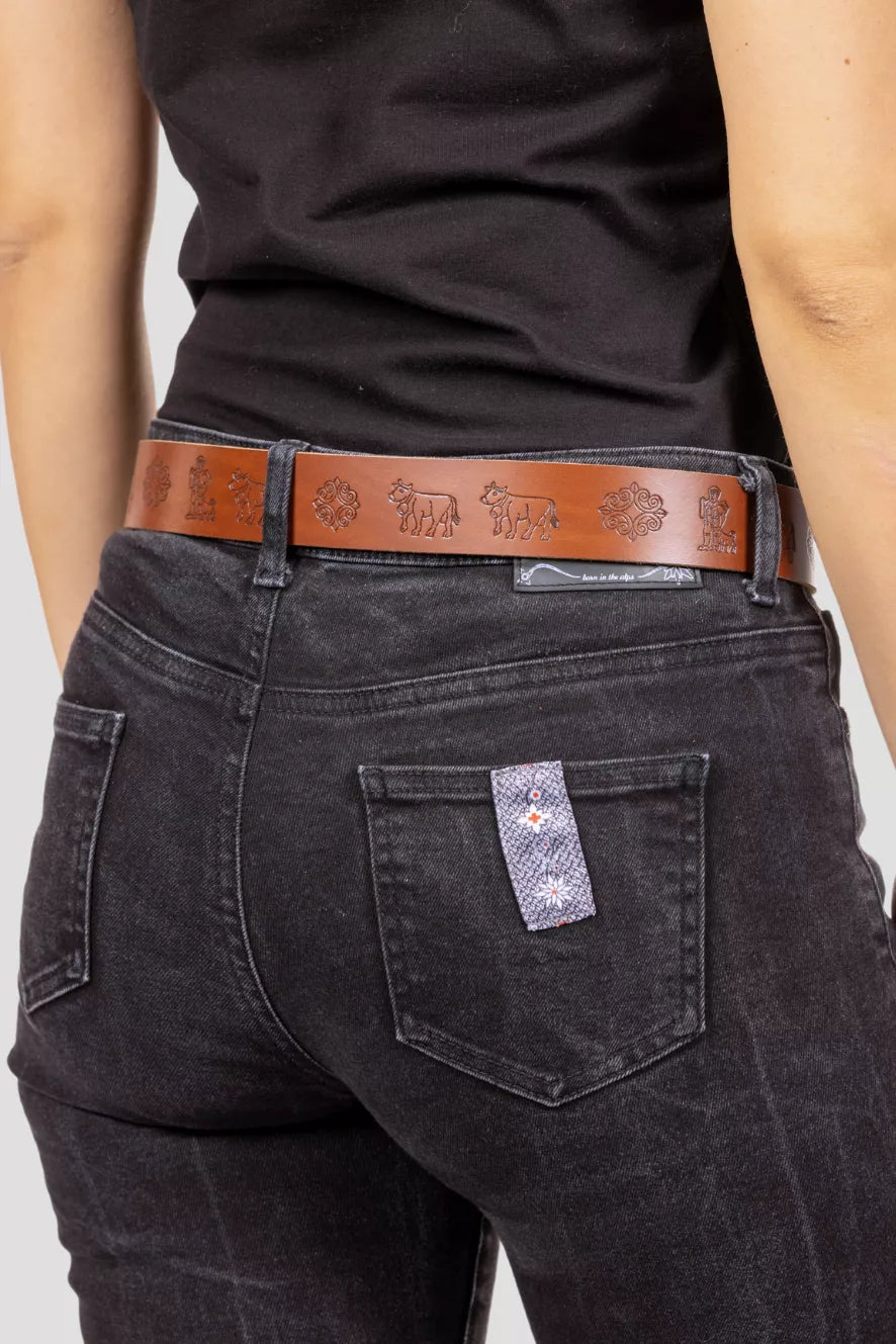 Der Appenzeller Gürtel aus dunkelbraunem Leder verbindet traditionelle Schweizer Trachtenmotive mit moderner Eleganz. Die feinen Gravuren von Kühen und Blumen machen ihn zu einem stilvollen Accessoire, das Qualität, Tradition und Handarbeit aus der Schweiz vereint.